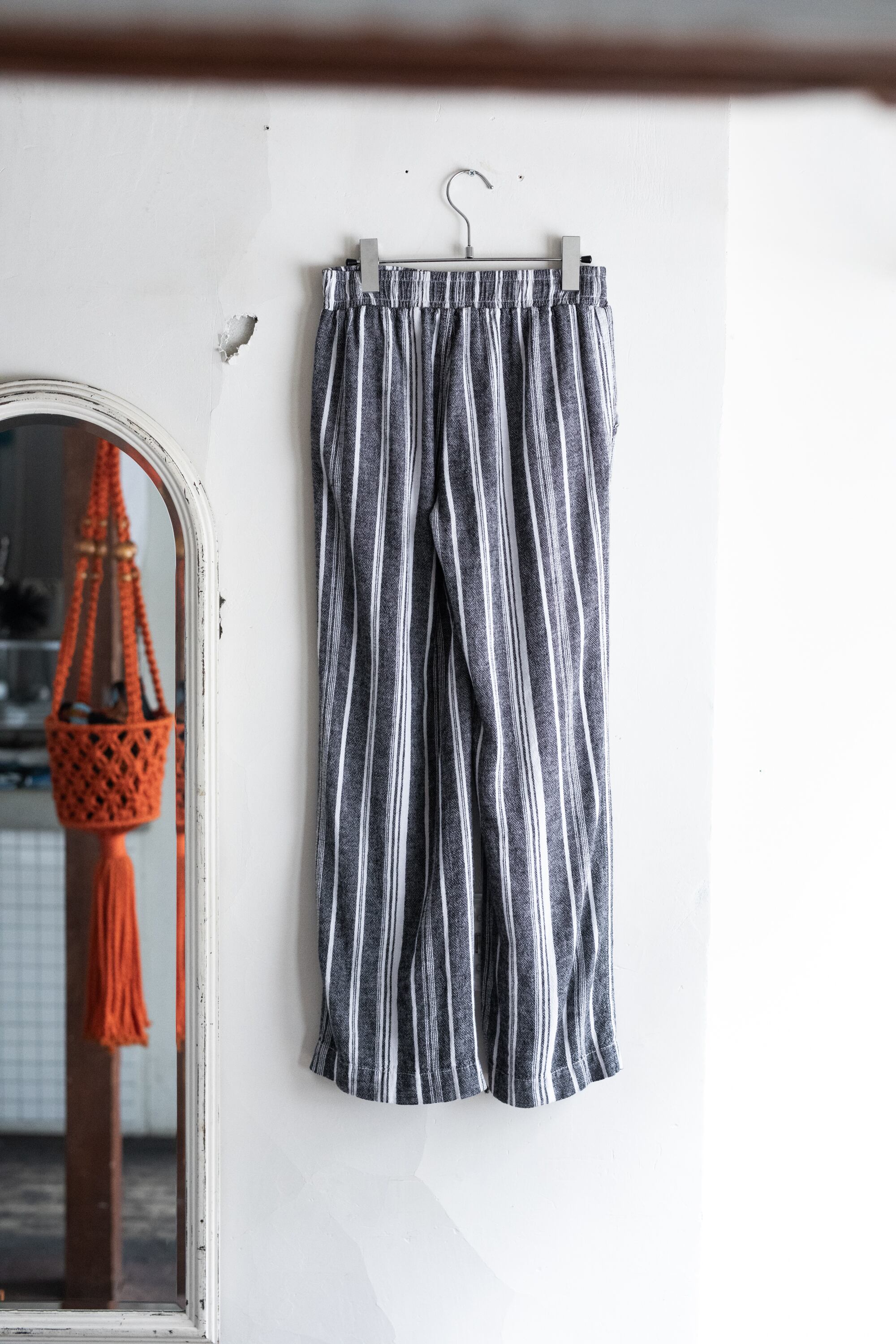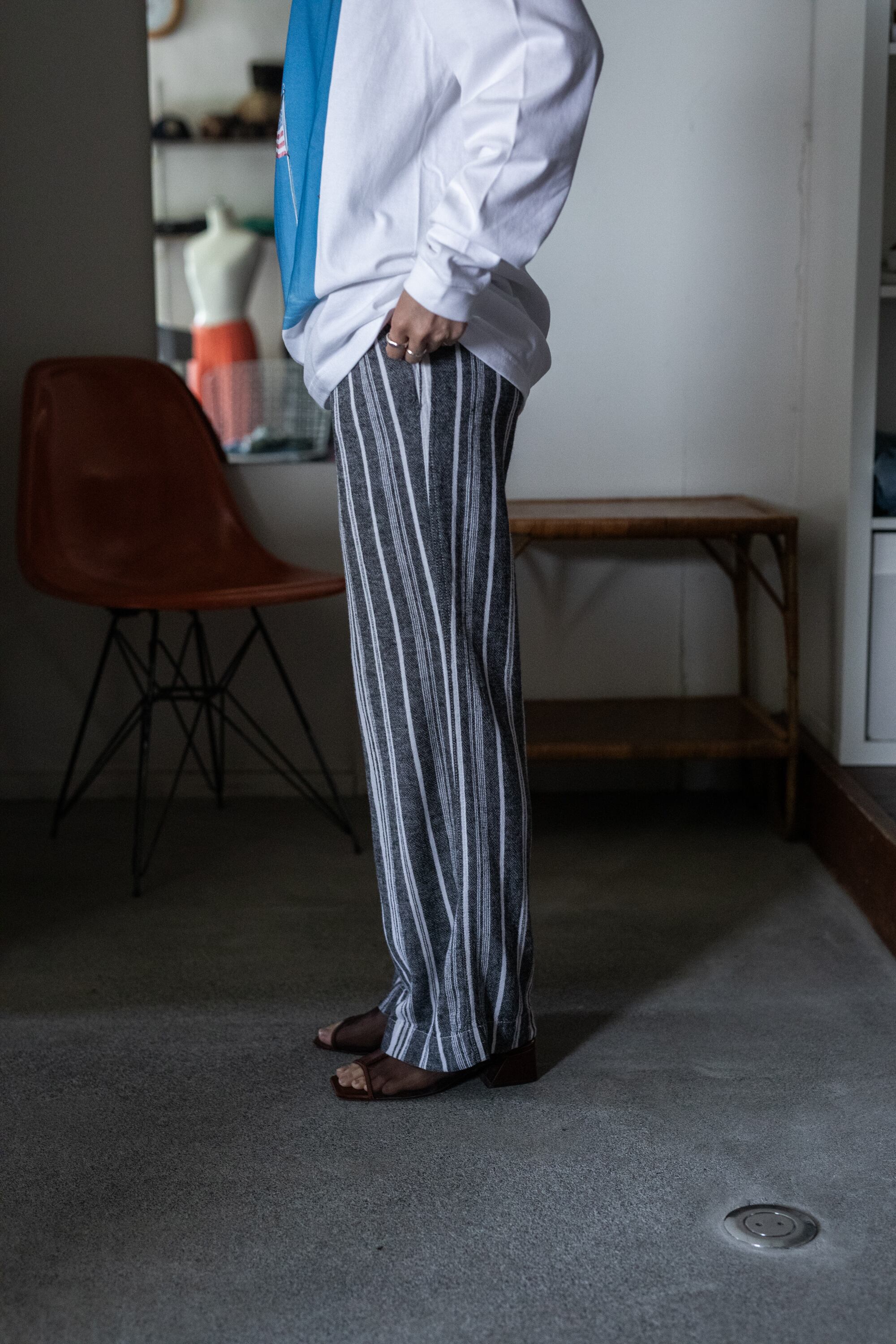 モノトーンのリネンレーヨンマルチストライプパンツ。